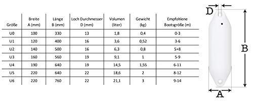 Schützen Sie Ihr Boot oder Ihre Yacht effektiv mit dem HonuNautic 2er Set Fender. Dieses hochwertige Set besteht aus zwei hocheffizienten Fendern in der Größe U0 (Ø 10 x L 33 cm) und der eleganten Farbe Weiß. Zudem erhalten Sie zwei passende Fenderleinen in einem dunklen Blau, die jeweils 2 Meter lang und mit einem Durchmesser von 8 mm ausgestattet sind. Eine praktische Aufhängeschlaufe mit einem Durchmesser von 18 cm auf einer Seite erleichtert die Montage der Fender.