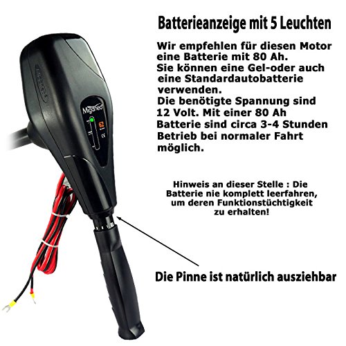 Ein wichtiges Feature dieses Elektromotors ist die integrierte Ladestandanzeige. So haben Sie jederzeit einen Überblick über die verbleibende Batteriekapazität, was vor und während der Bootsfahrt von großem Nutzen ist.